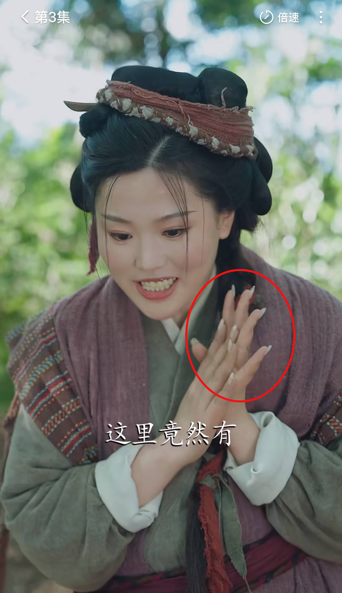 但镜头一转,手上一幅现代感十足的美甲,看得人十分出戏。