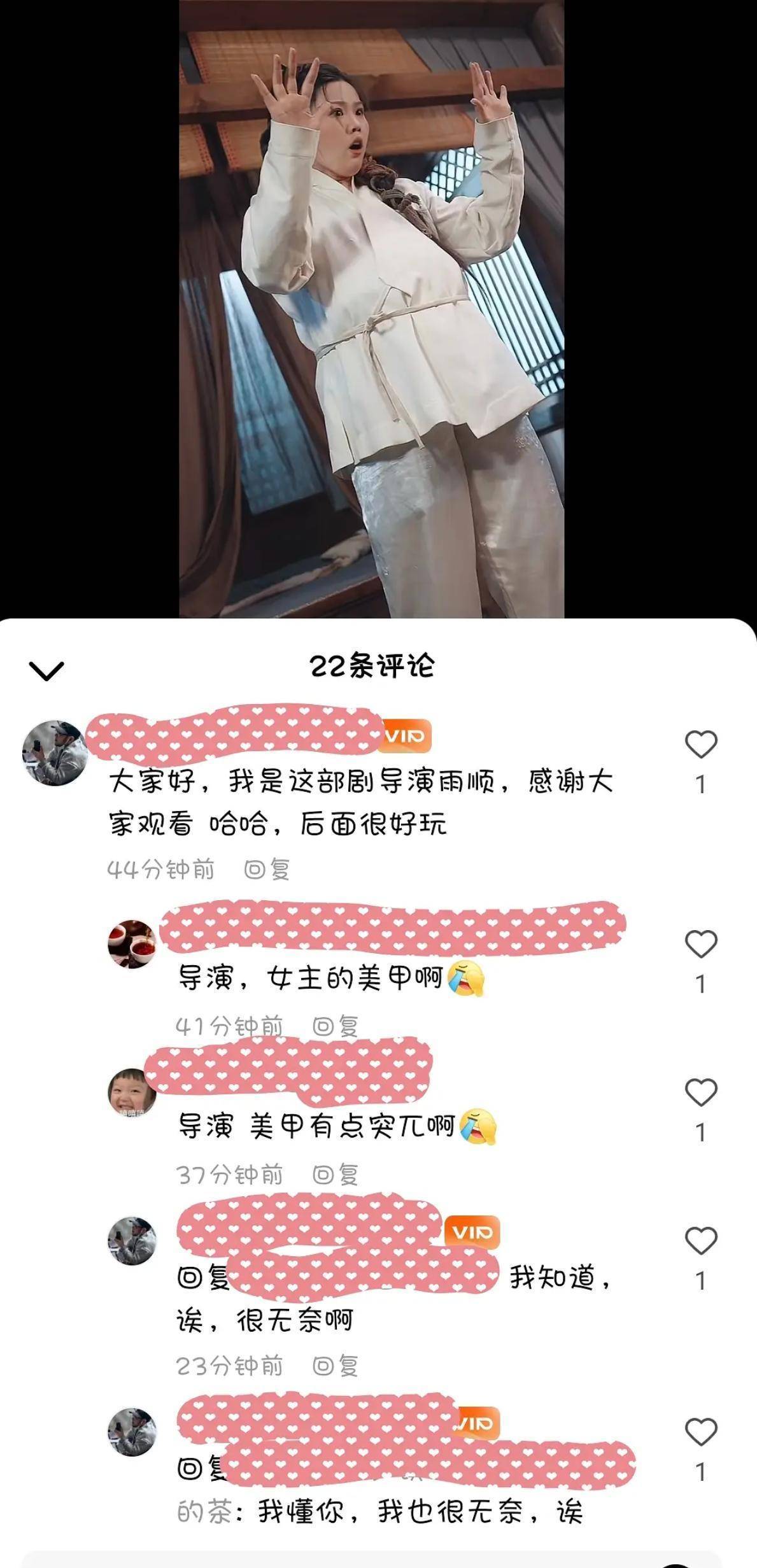 该剧的导演雨顺在剧播出的时候出现在评论区,网友立马跟导演反馈:女主的美甲有点突兀。