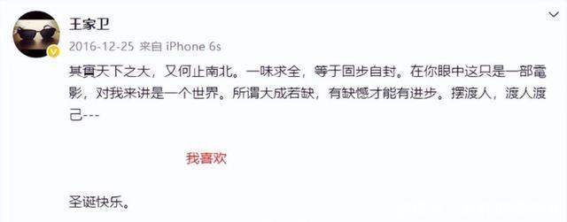 当然,这其中也有头铁的演员,试图进行对抗。 2016年,由王家卫监制的电影《摆渡人》上映,由于剧情雷人,被大众吐槽成年度烂片。 可就是这样一部烂片,却因为王家卫导演的一句“我喜欢”,获得半个娱乐圈的人跟风点赞。