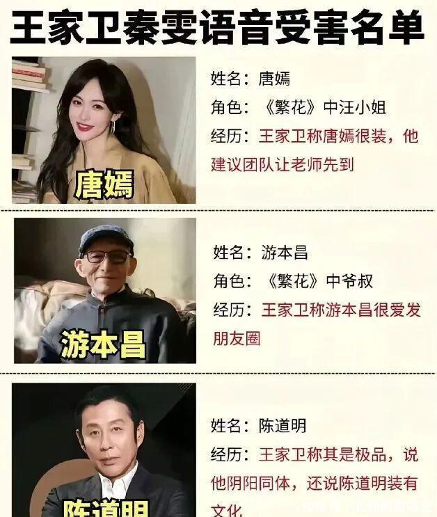被逼无奈下,他只能选择“鱼死网破”的方式来引起大众的关注和重视。 即使他明知自己的所作所为属于违法,但也不惜揭露王家卫私下的“真面目”。 于是,一段王家卫与主编剧秦雯等人私密谈话的录音就这样在网上流传开来。 录音提及的王家卫碎嘴八卦,大概可以总结如下: 1、说唐嫣很装,拍戏总先到,那编剧就要比她先到,让她装不起来。 2、吐槽游本昌年纪那么大还爱发朋友圈,一天发三条朋友圈,不是省油的灯。 3、调侃陈道明是极品,记不住大段台词,所以就爱改台词。